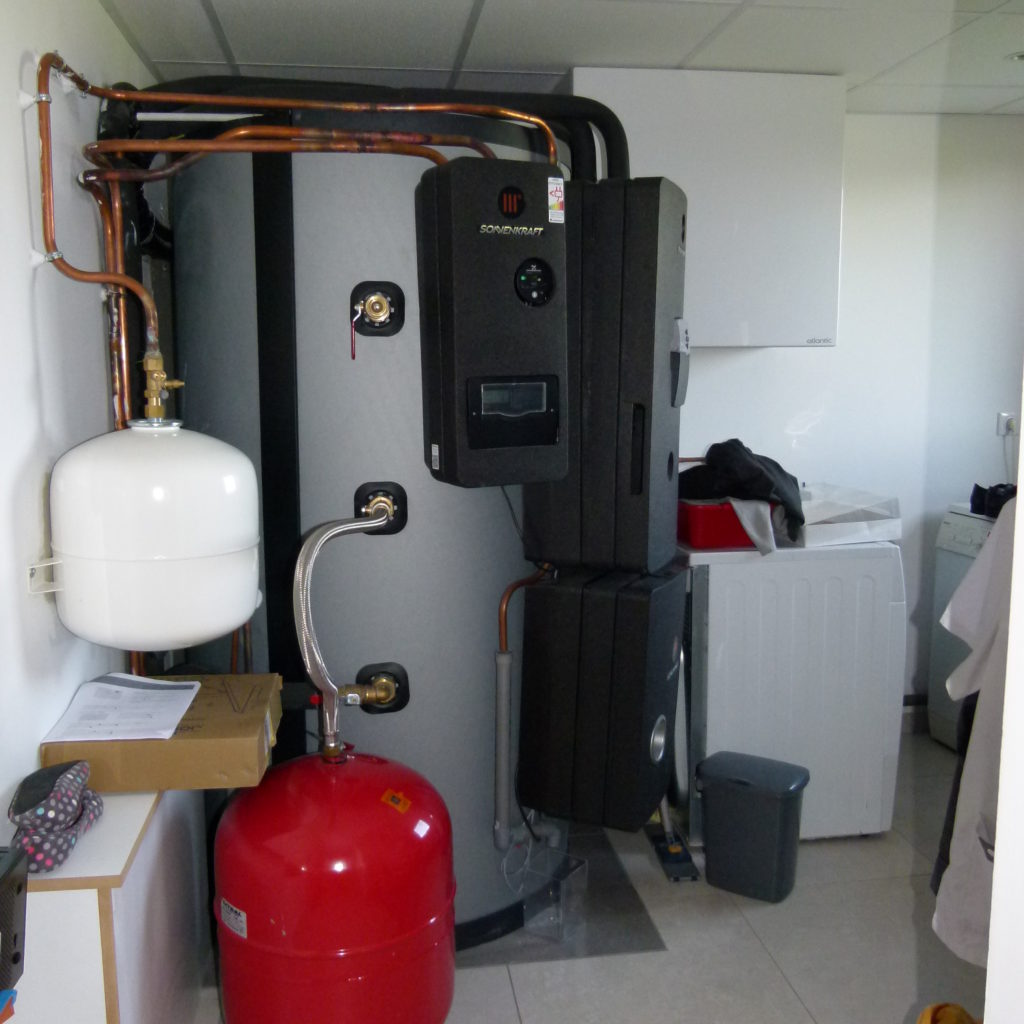 Il s’agissait de la construction d’une maison neuve NORME rt2012 avec un système de production solaire pour le chauffage avec un appoint par poêle à bois-buche bouilleur (hydraulique) qui alimente un plancher chauffant basse température. Pour l’Eau Chaude sanitaire les capteurs solaires alimentait un ballon avec un appoint électrique pou les jours sans soleil.